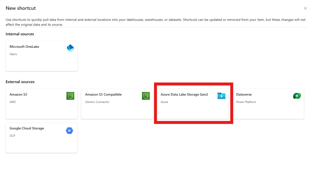 - Select the “Azure Data Lake Storage Gen2” under “External Sources”.