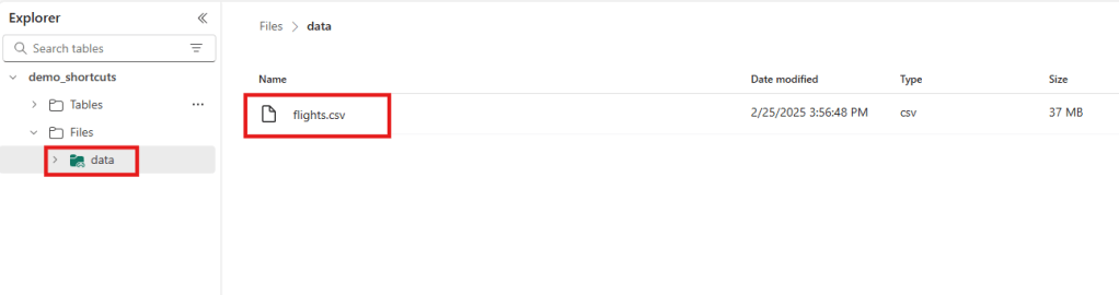 - By clicking on the new shortcut folder “data” we can see the “flights.csv” file and interact with it.